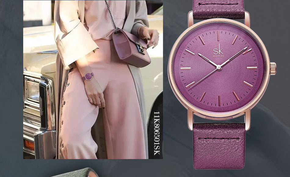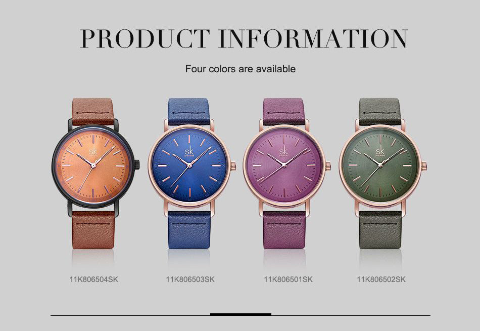 Introducing the Shengke SK8065 unisex watch, a perfect blend of style and functionality. Designed with a sleek round dial that features a stunning selection of colors including Purple, Green, Blue, and Coffee, this watch is a statement piece for any occasion.