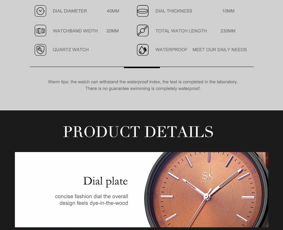 Crafted with imitation leather straps and an alloy case, the SK8065 is not only fashionable but also durable. Its quartz movement ensures precise timekeeping, while the 30M waterproof feature allows you to wear it confidently in various environments.